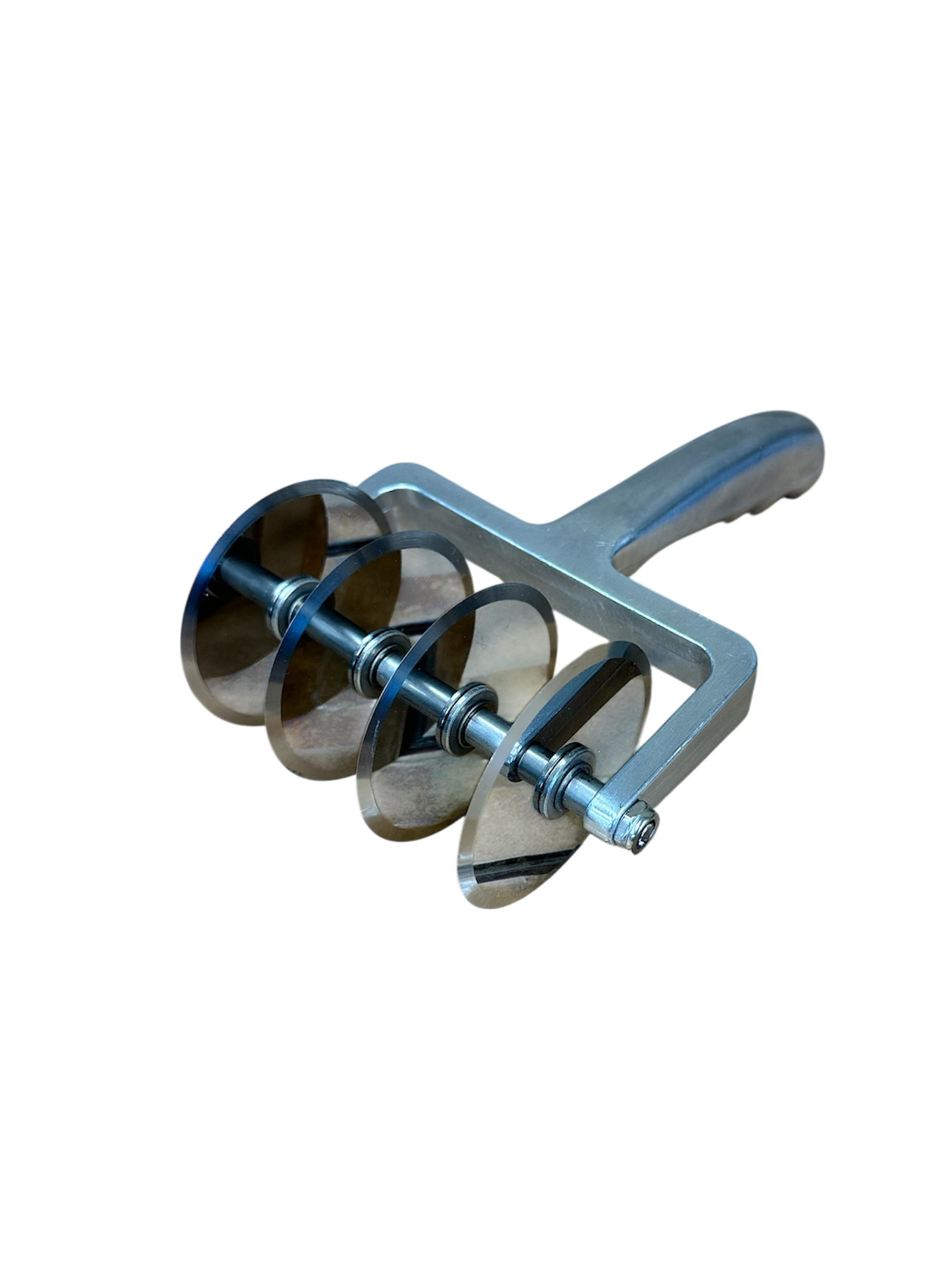 Portion dough precisely with our bread stick cutters, featuring a cast aluminum handle and replaceable stainless steel blades that glide on bushings for smooth cuts. Options include sealing rollers, serrated, or double blades for versatility.